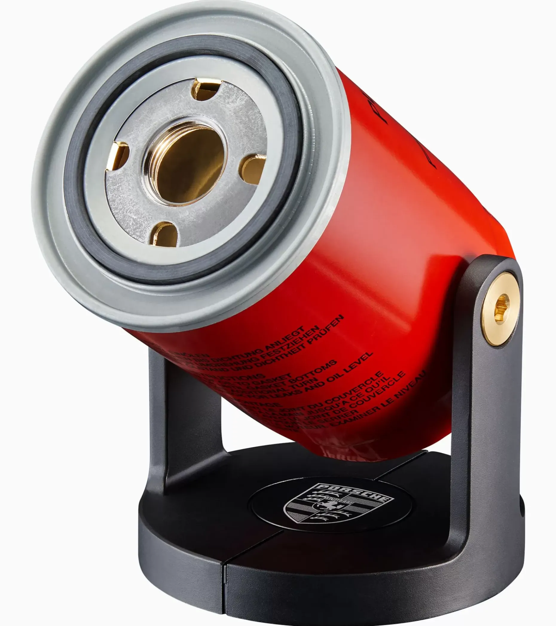 Fa Luce! L’Esclusiva Torcia 911 Non Solo Porta La Luce Nell’Oscurita, Ma Anche Un Tocco Di Design Intelligente Nell’Ambiente. La Torcia E Costituita Da Un Filtro Dell’Olio Originale Di Colore Rosso Con Stampa Nera Originale E Puo Essere Accesa E Spenta Utilizzando La Funzione Touch Nella Base. Led Da 3500 Kelvin E 160 Lumen. Made In Germany.